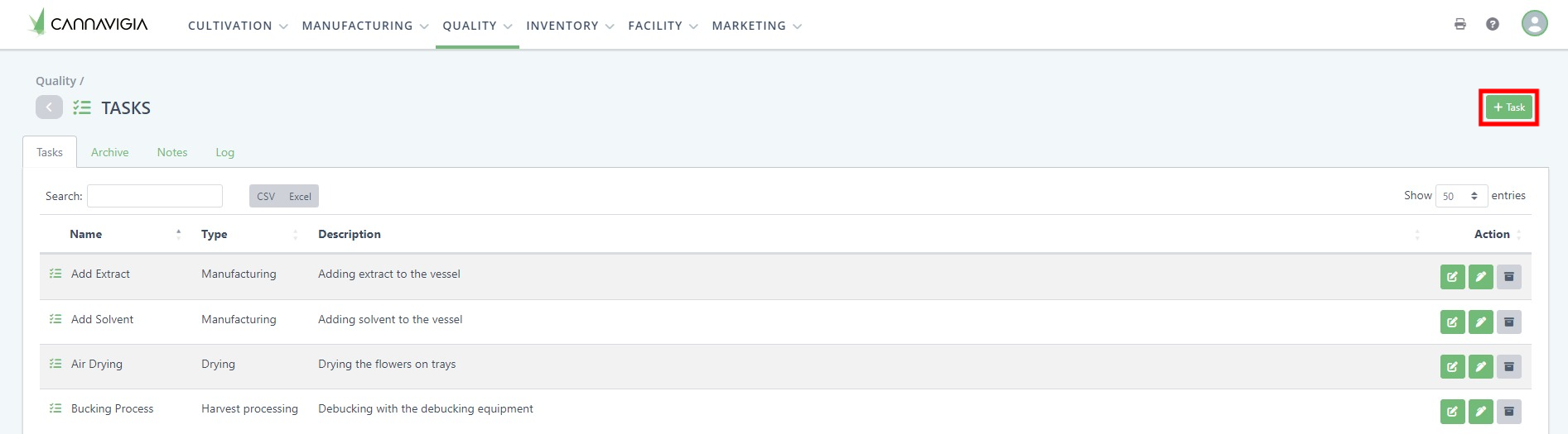 In the Tasks Setup page (Quality > Tasks Setup), various tasks (work processes) can be added which can range from soil management to irrigation of your cultivation or harvesting activities.