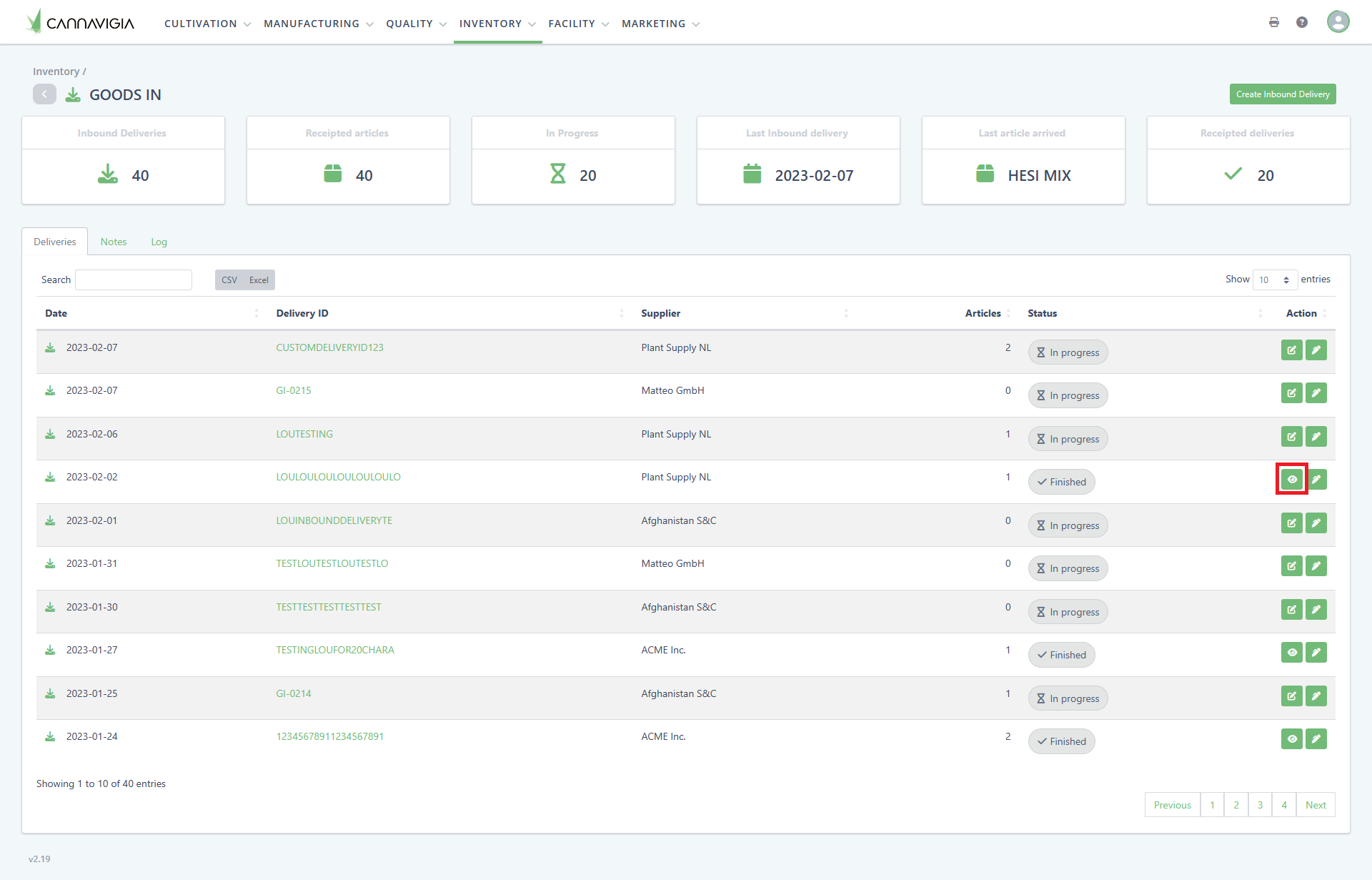 Once an Inbound Delivery has been created, it will appear in the Deliveries tab within Inventory → Goods In.