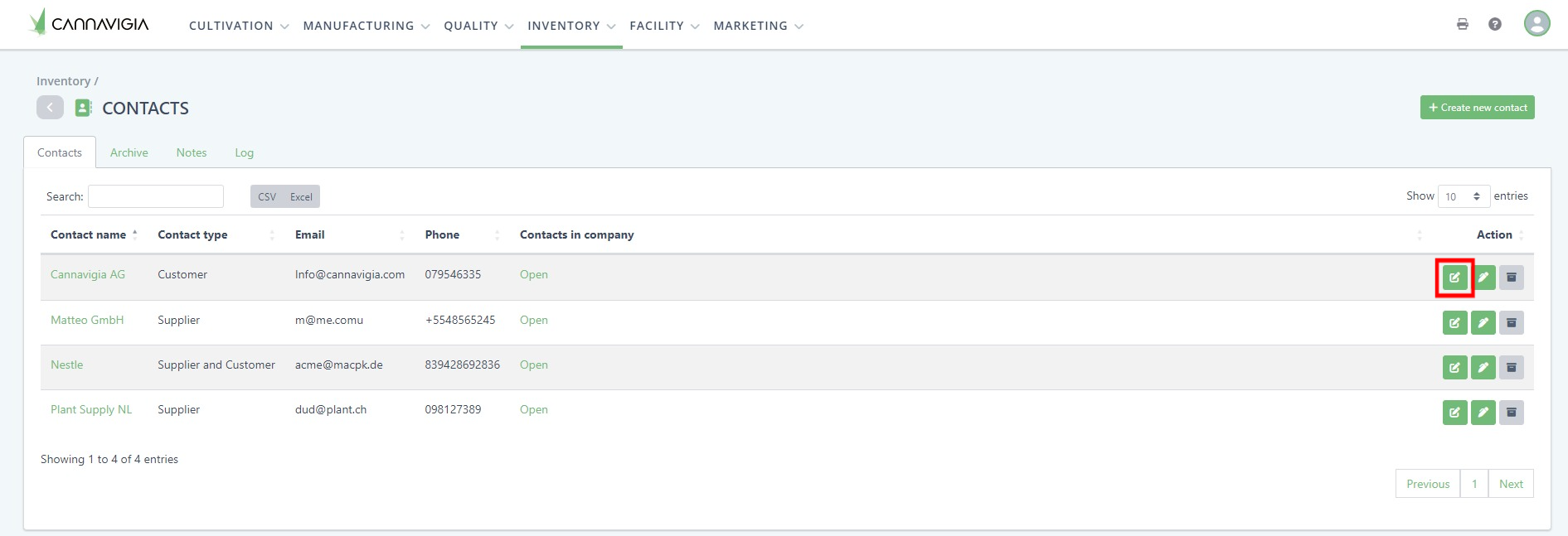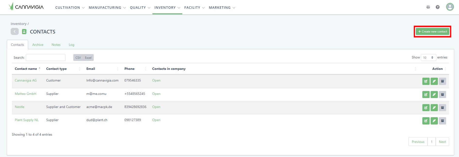 The Contacts page (Inventory > Contacts) functions as an online address book where you can create and manage all your suppliers, service providers, and customers.