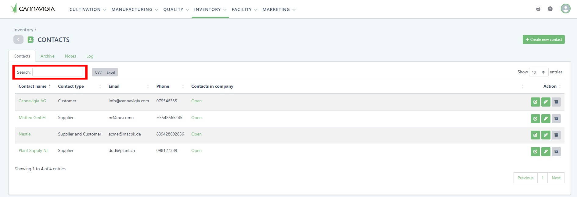 To find contacts faster, you can use the Search function at the top left of the Contacts page (Inventory > Contacts). As soon as you start typing, the search automatically displays all the hits in the list.