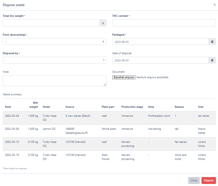 Click Dispose to accept the entries and close the dialog box. Your waste container is now empty; you will see it in the Waste Container tab with a Weight of 0.000kg and the red button Dispose hidden.