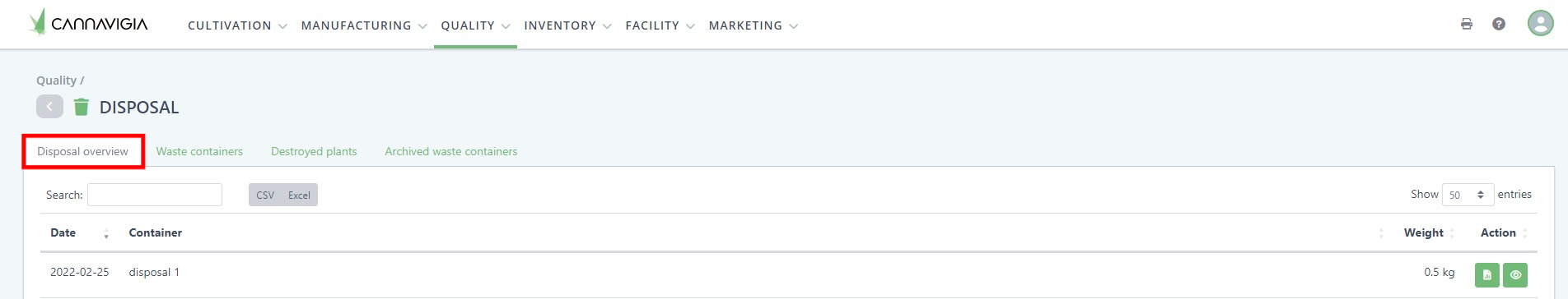 Disposal overview can be seen in the Disposal overview tab on the Disposal page (Quality > Disposal).