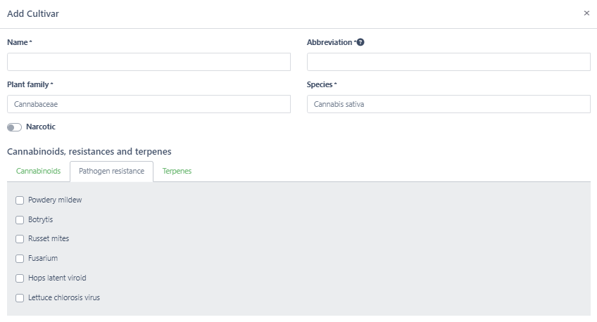 In the Cultivars page (Cultivation > Cultivars) you can create your own database of cultivars.