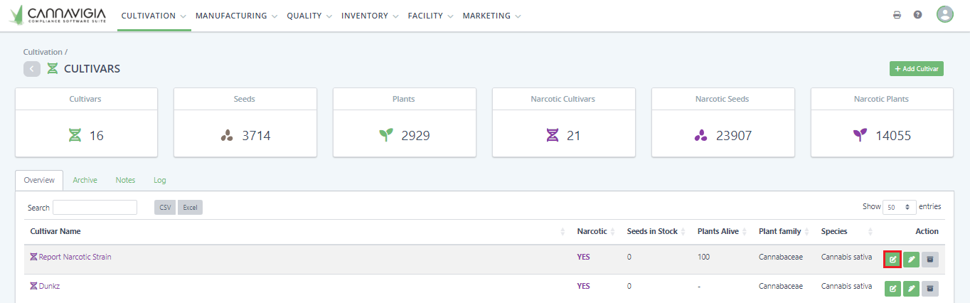 In Cultivation > Cultivars, in the Overview tab, you can see all saved cultivars. You can edit any of your cultivars at any time by following these steps: