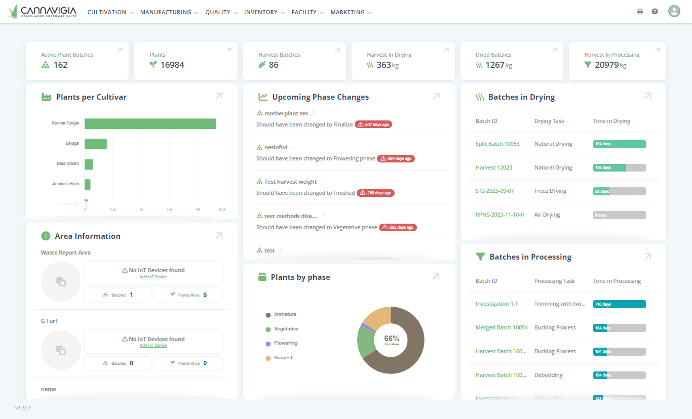 Area Information: A list of all cultivation areas with information about the number of batches, plants, and IoT data.