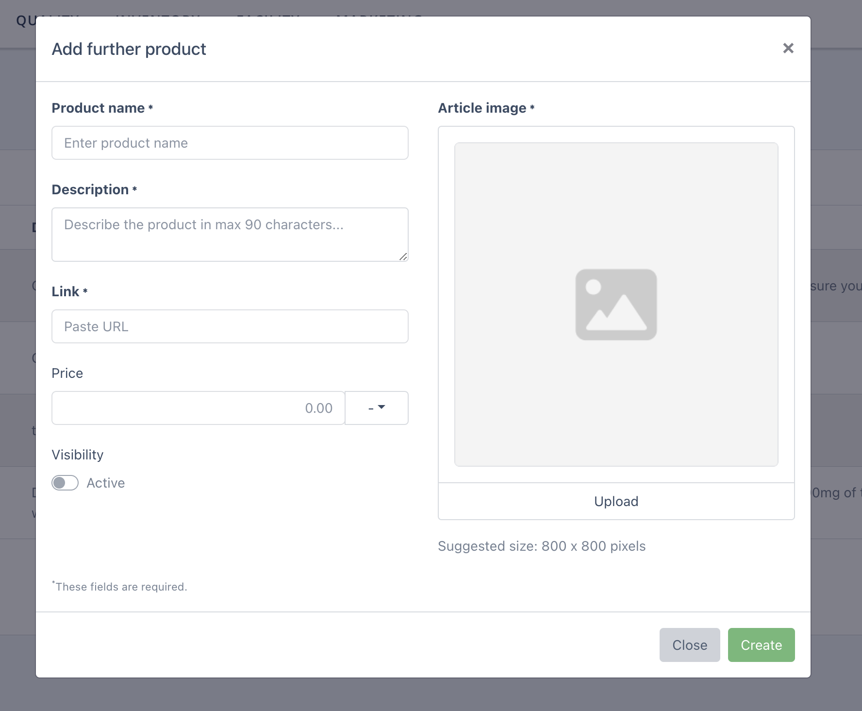 Select the Visibility of the product. If you would like to make your product active, set the visibility toggle to on. You can display up to 4 products (visibility = active) at a time. Those are the products that will be shown on the landing page.