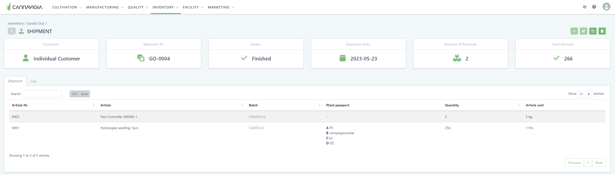 In the Goods Out page (Inventory > Goods Out), you can get an overview of all goods leaving your inventory. Each outgoing shipment has its own Shipment ID, recognizable by the prefix GO-. A Shipment can contain several articles.