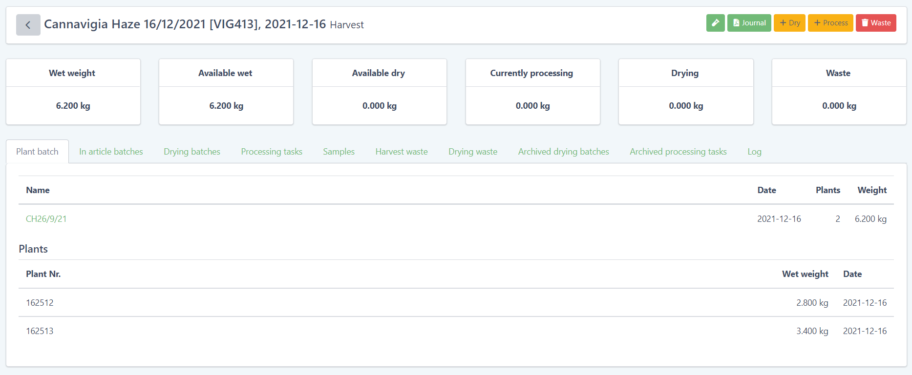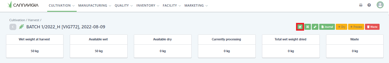 If waste is produced during harvesting, for example trimmings such as stems and leaves, this can be logged using the record waste button of the corresponding harvest batch.