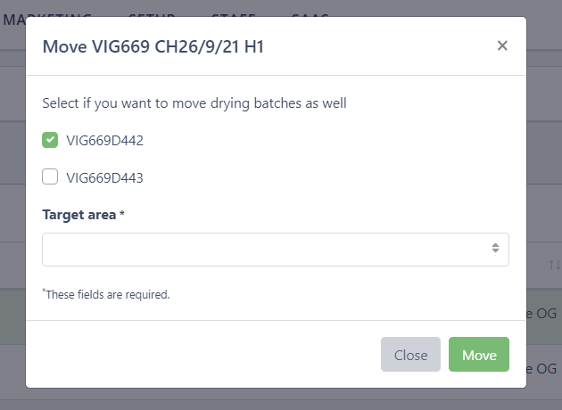 To move a harvest batch between different areas click on the harvest batch you would like to move. Selected harvest batches appear with a green brackground. Multiple harvest batches can be moved at the same time.
