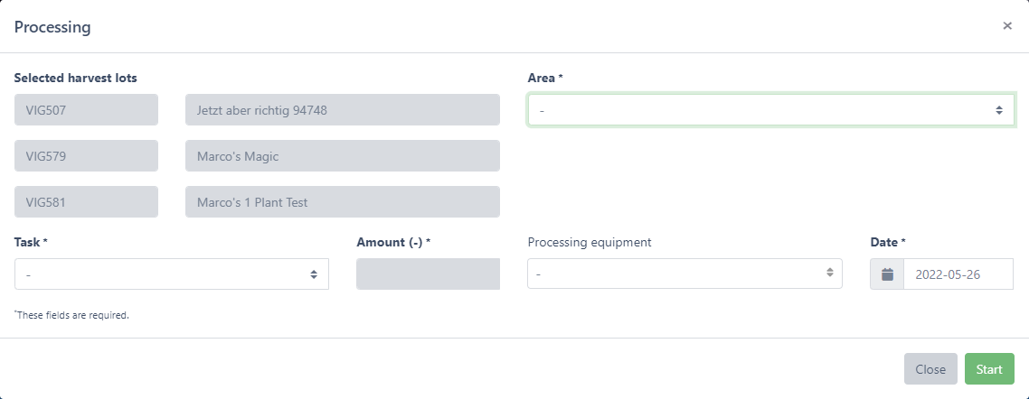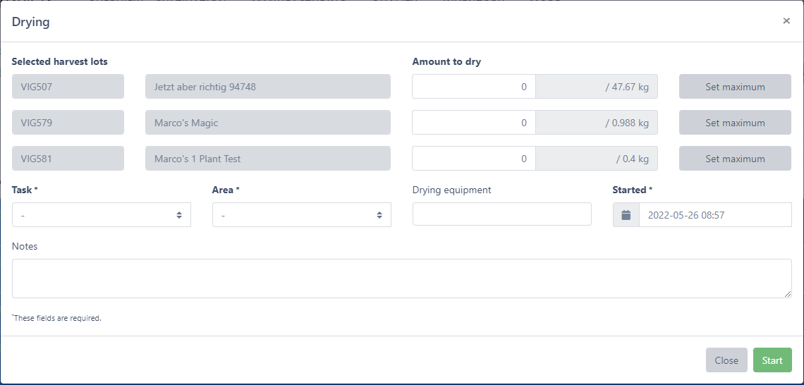 Note: You can select multiple harvests to start drying at the same time. Click with the left mouse button on the desired batch to select it. Selected fields are marked in green.