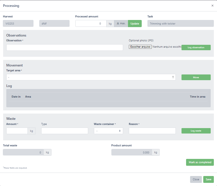 Next, you can log observations, move your batch to other area and record waste.