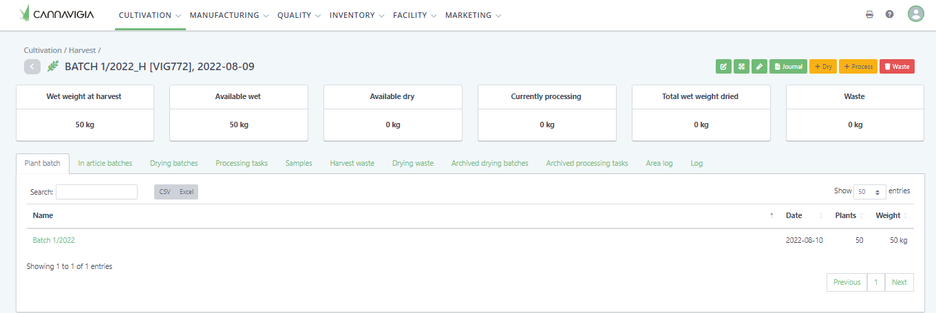 The drying of flowers and biomass is a central step in the processing of cannabis and is documented in the software separately from the other processing steps.