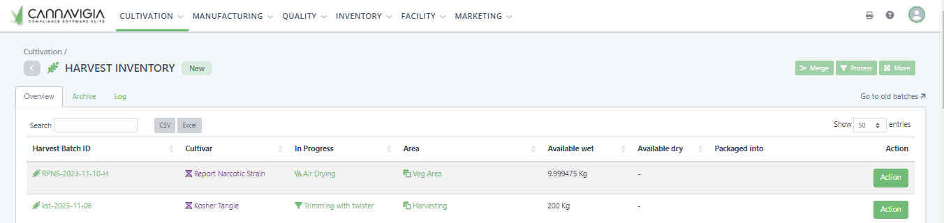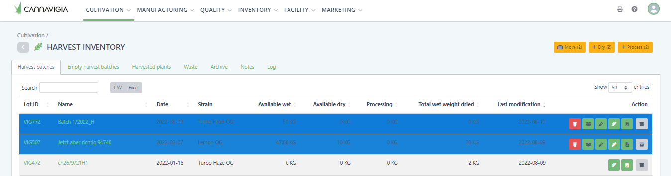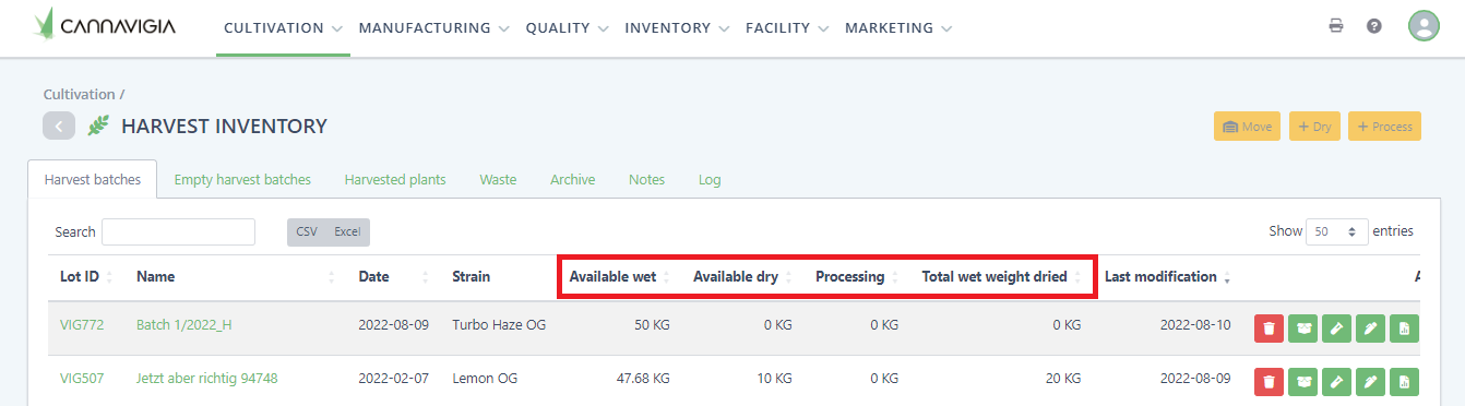 From the Harvest Inventory page, you will still be able to see all your Harvested batches, waste related to the harvest, notes as well as the harvest log. Additionally, you can see the sum up of how much Available wet and Available dry harvest you have, how much is Processing and Total wet weight dried.