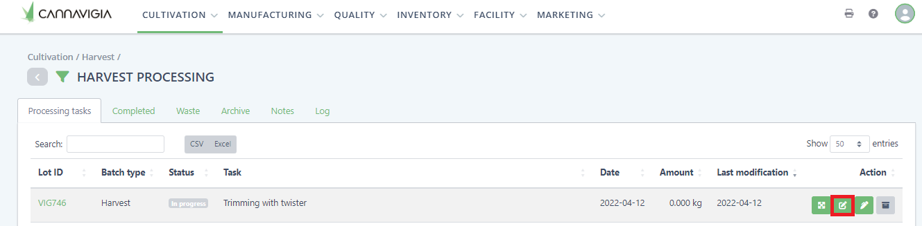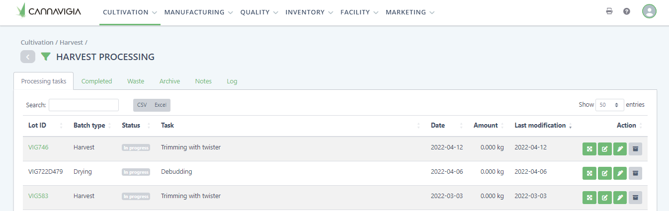 You will be redirected to the Harvest Processing tab (Cultivation > Processing Tasks) where you can see all ongoing processing tasks.