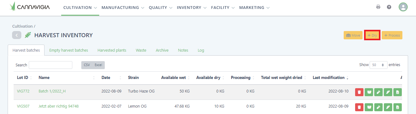 After selecting the batch(es) you want to dry, click the yellow + Dry button to start the drying process.