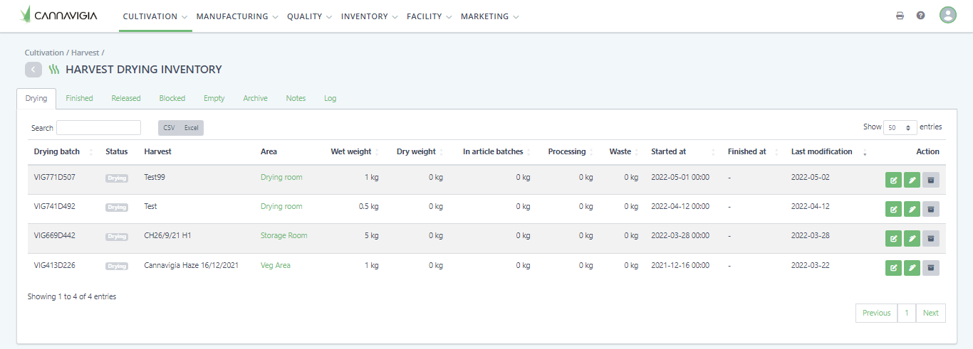 From the moment a batch starts the drying process, the actions related to a drying batch can be found in the Drying inventory page (Cultivation > Drying). Here, you can see your drying batches separated into tabs: Drying, Finished, Released, Blocked and Empty.