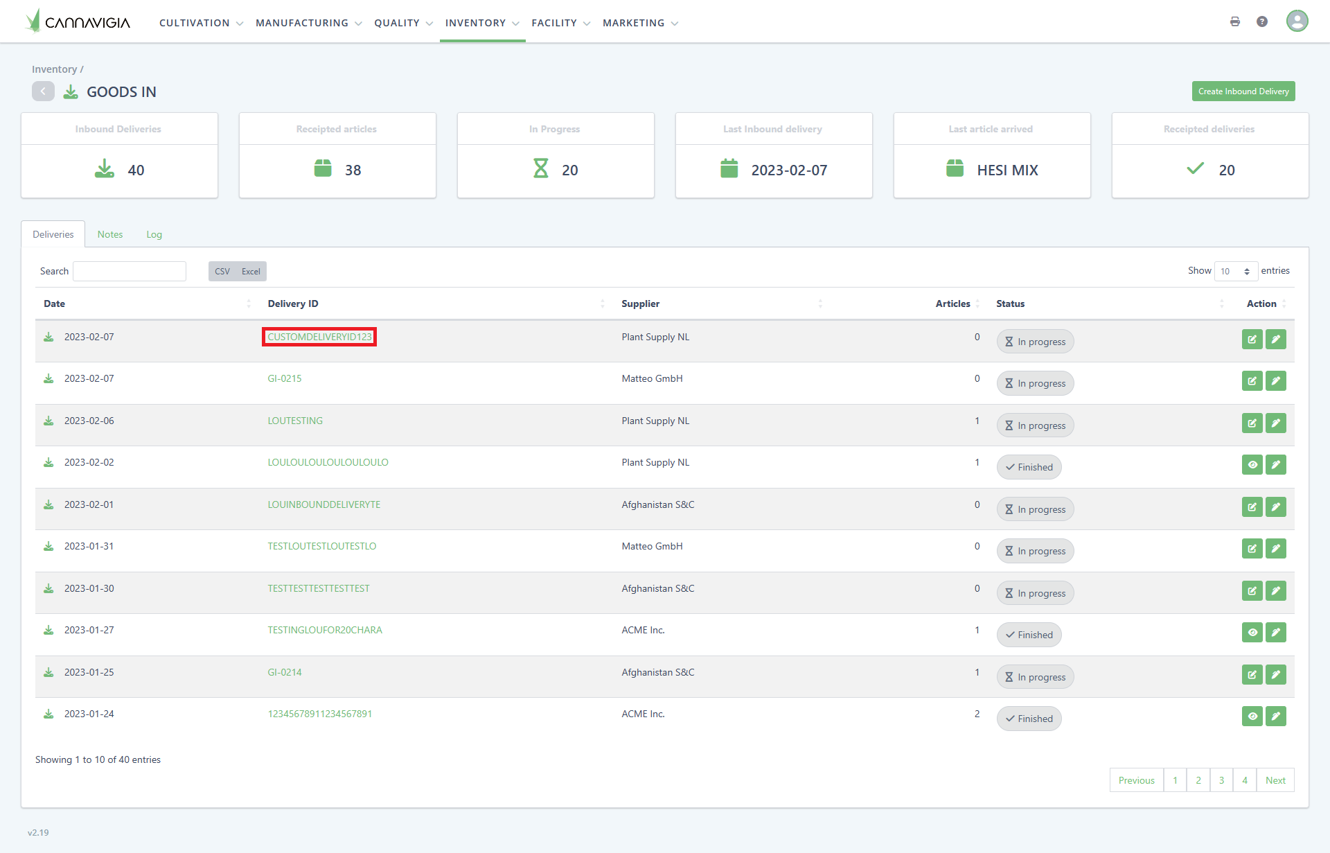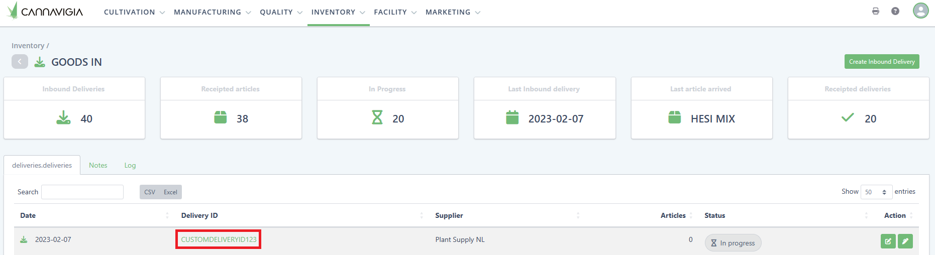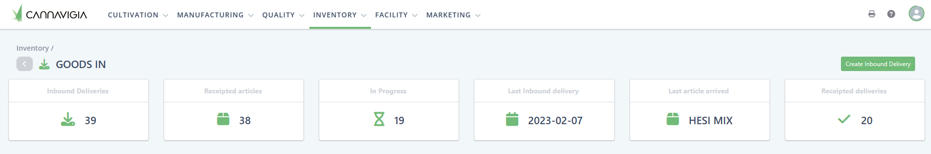 Navigate to Goods In via Inventory → Goods In and select your required Delivery Note ID by clicking on the green hyperlink of the Delivery Note ID to access the Inbound Delivery Detail View, if you are adding the Articles at a later date / time.