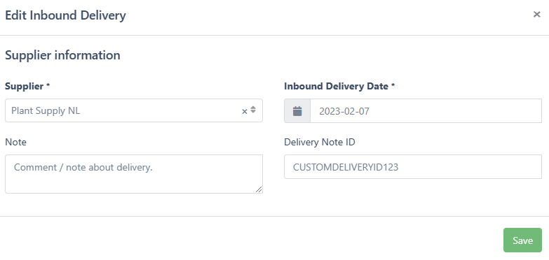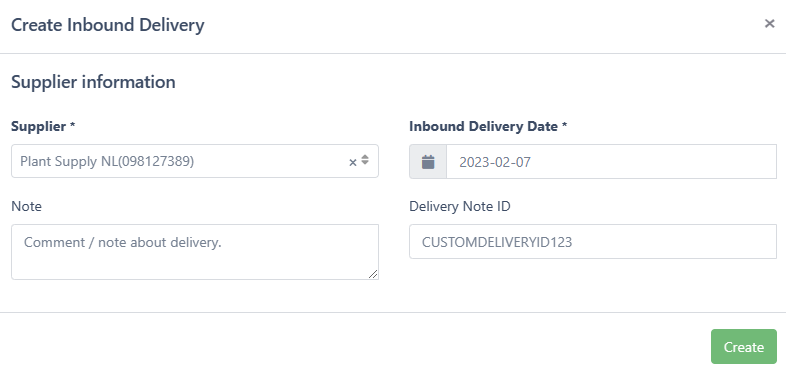 From the ▼ drop-down menu, select the Supplier and then select the Inbound Delivery Date and type in the Delivery Note ID if you want to customise it.