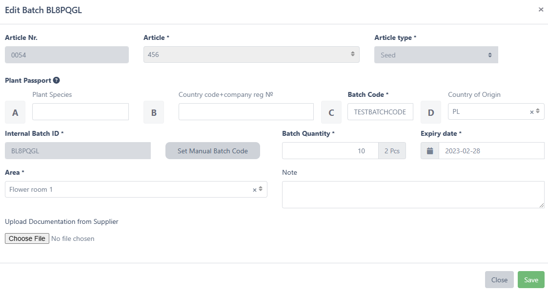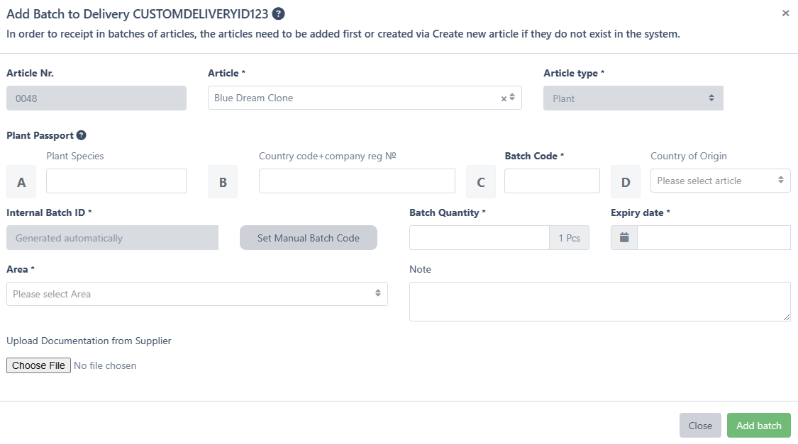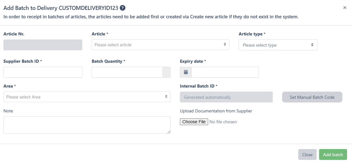 This is the batch code provided by the supplier that you can use to reference in case of any defects/faults. If the article batch is registered in the system, the packages will receive a new label with a QR code and new Batch number. By storing the Supplier’s batch code, you ensure that you have all the information available in the event of problems.