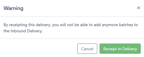 Click Receipt in Delivery button within the Warning modal, to be able to finalise the delivery and receipt the Received Batches