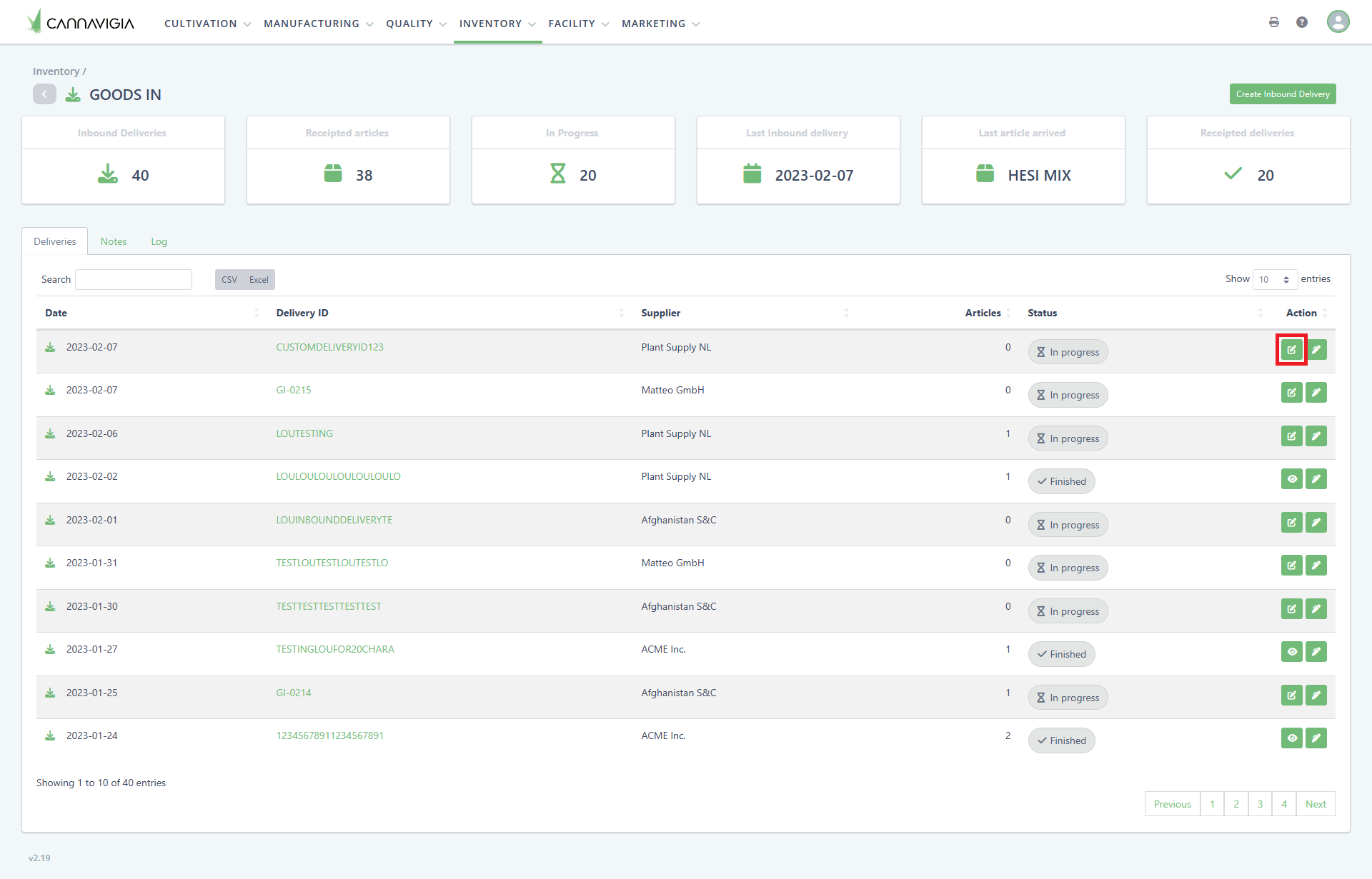 Select which Inbound Delivery you would like to edit by clicking the Edit button under the Action column within the Goods In List View, on the row of your required Delivery ID.