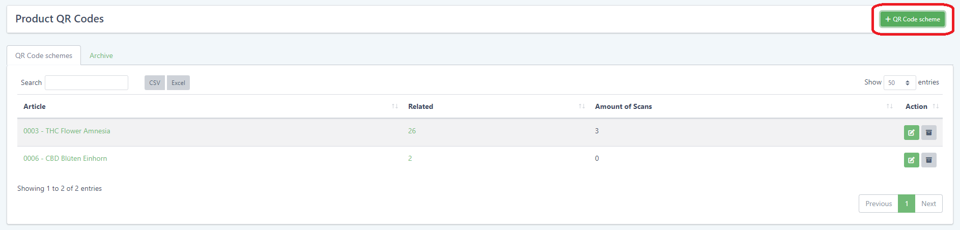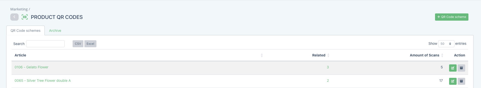 In the Product QR codes page, you can see all your created QR code schemes as well as archived schemes in the Archive tab. For each product QR code scheme, you are able to see which Article batches it is linked to and the number of times the QR code has been scanned.