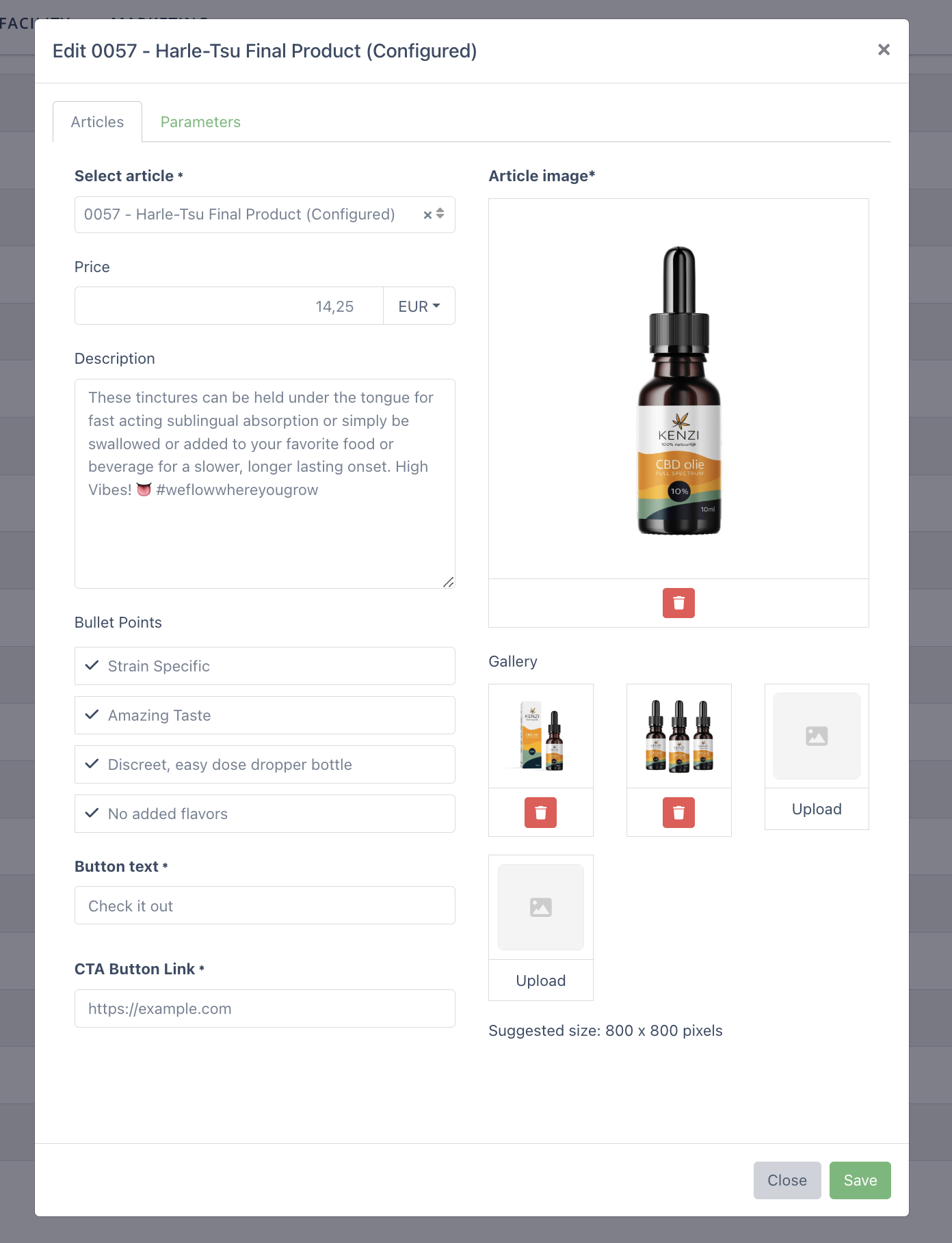 In the Parameters tab, select the parameters which you’d like to display on the landing page. These are the parameters of the article (information entered for cultivar, plant batch, during harvest processing etc.) that will be displayed when a user scans the product QR code.