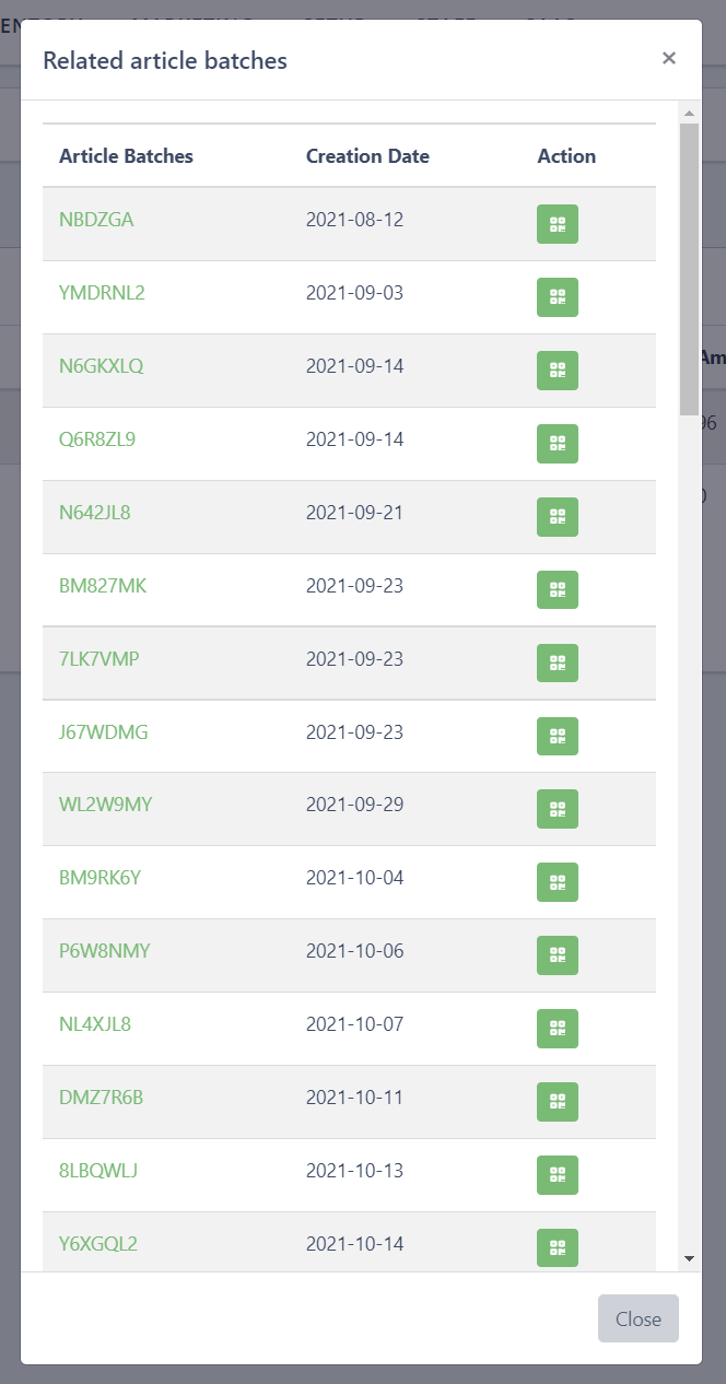 Clicking on the number in the Related column displays all article batches of this article and their respective QR code.