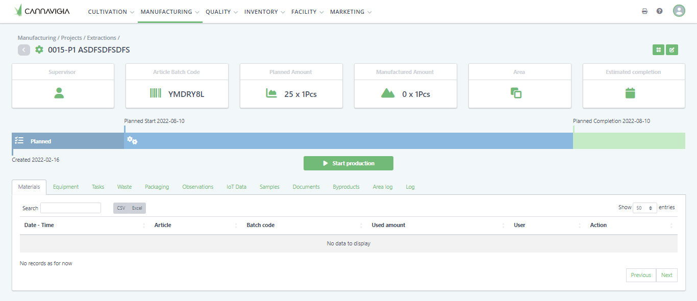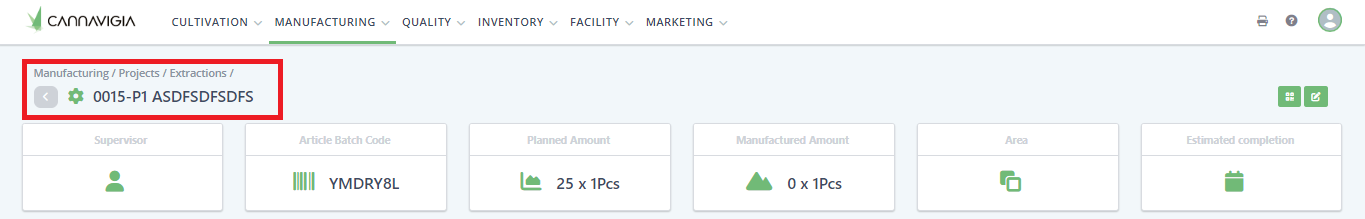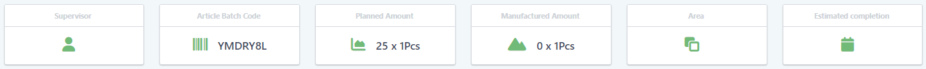 In the title bar you can navigate back to the project, see the manufactured article, batch code and production number. On the right hand side you will have actions based on the state the production is in.