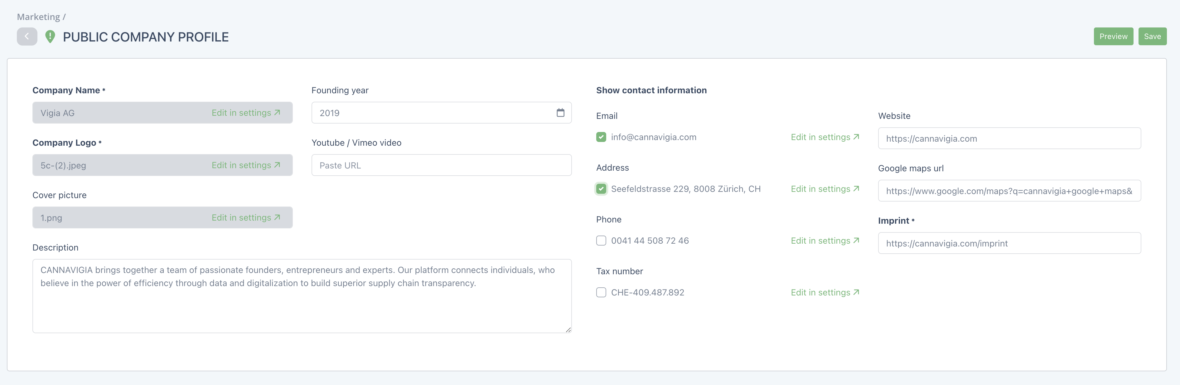 Your Public company profile page will open up with editable fields. For each field you can check or uncheck the green box next to it to choose whether to display that information on your public company profile.