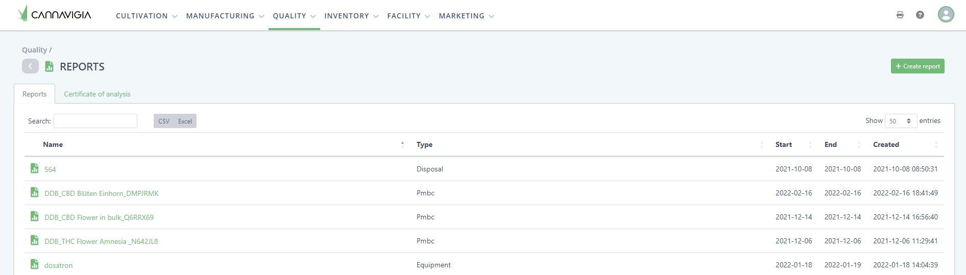 Under Quality > Reports it is possible to create reports on different topics such as waste and equipment with just a few clicks. The data already entered into the software generates the creation of a report over a selected period of time. For transparency reasons, the report is generated automatically and cannot be changed manually.