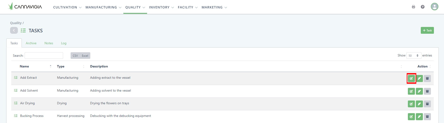 In Quality > Tasks, in the Tasks tab, you can see all your created tasks. You can edit any of your tasks at any time by following these steps: