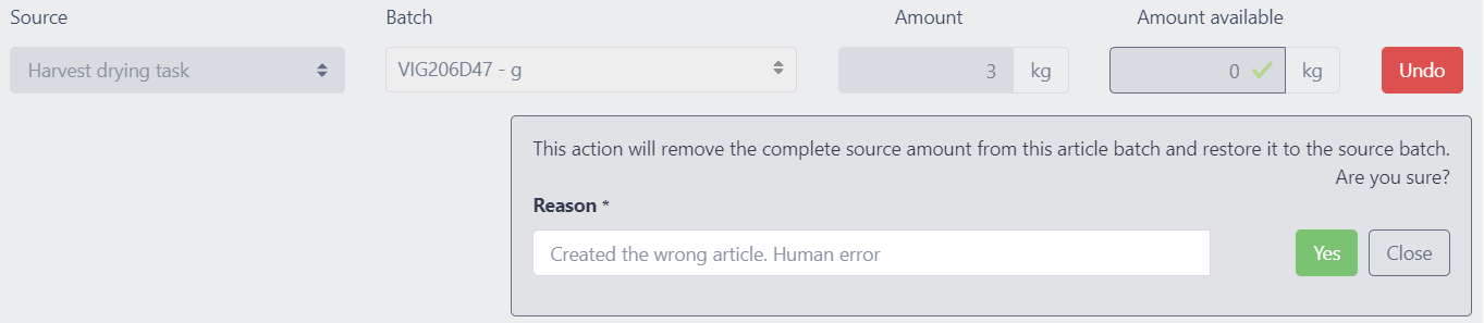 Mistakes happen. When an article batch gets accidentally or wrongly created from a harvest or drying batch, it can be simply undone. Clicking the undo button and entering a reason will remove and restore the full amount back to the source batch.