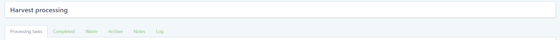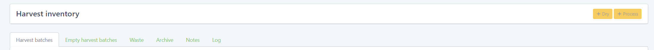 Similar to the drying inventory the “Harvest processing” section contains two tabs showing all the harvest processes currently in progress and the ones that have already been completed.