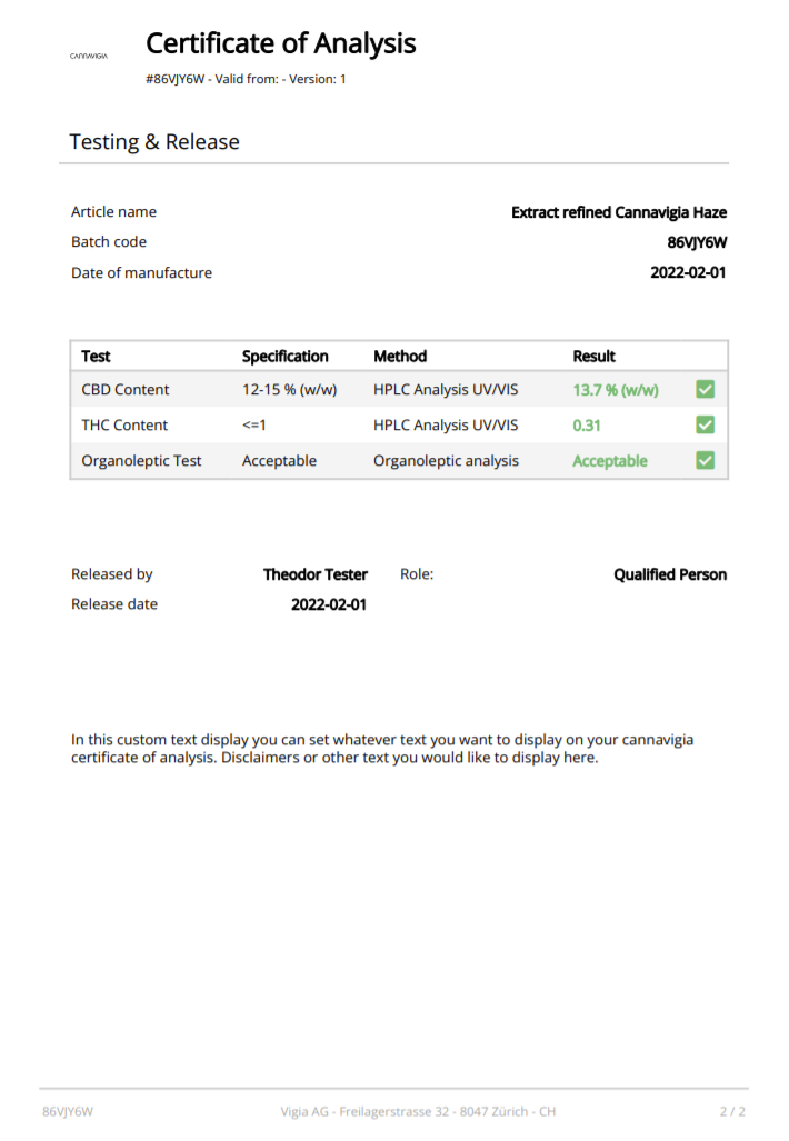 The design of the certificate of analysis has been updated. Additionally you can display a custom text at the bottom of the certificate by navigating to setup>reports and entering the information text.