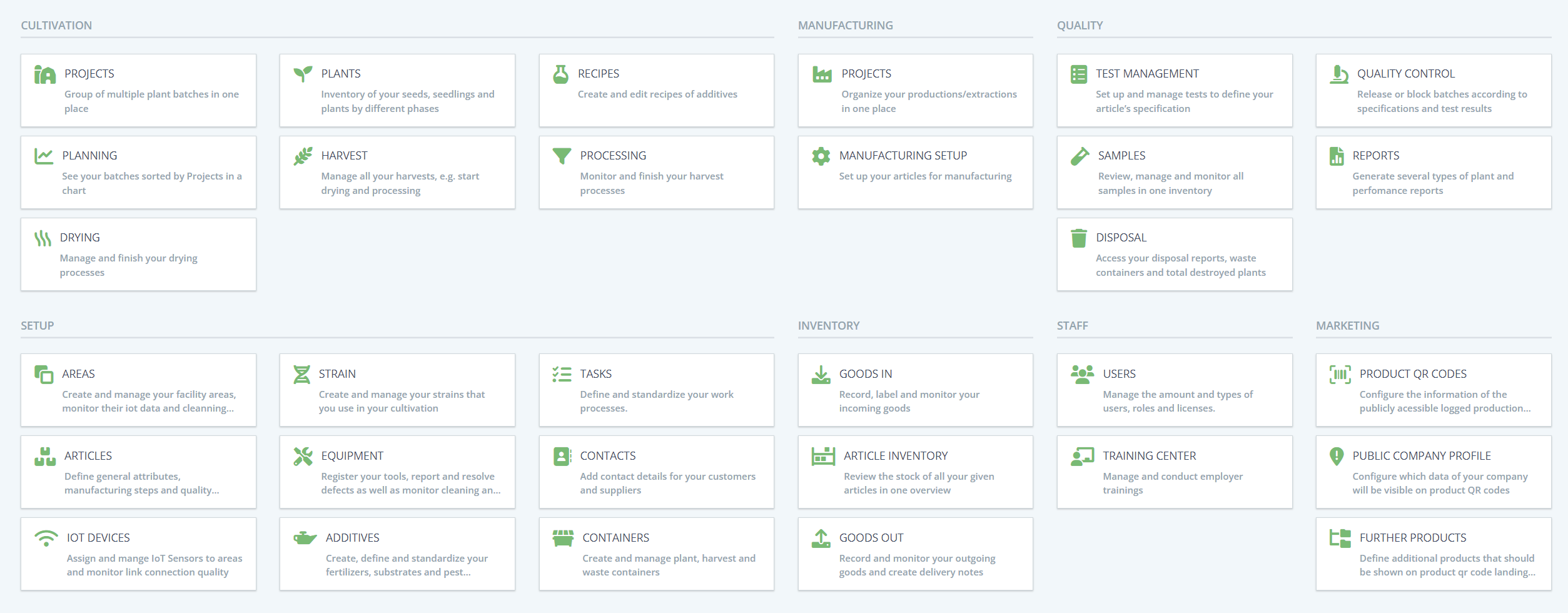 By clicking on the company logo you will be referred to an overview of all the functionalities of the Cannavigia Software with short descriptions. Click on the boxes to navigate to the respective view.