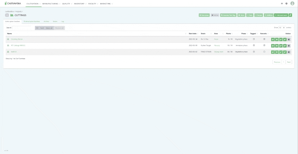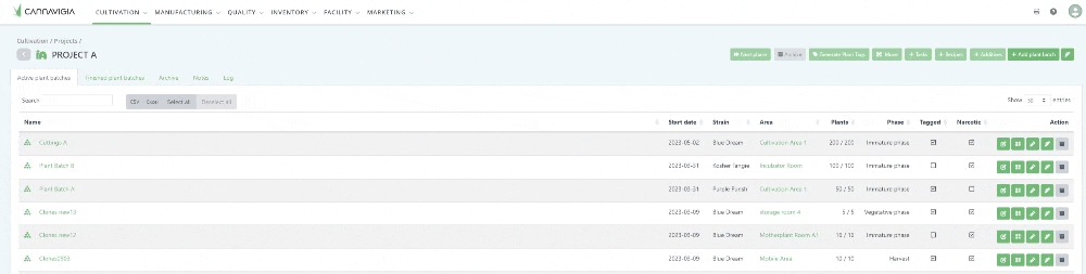 It is possible to move multiple plant batches to the same sub-area in one action. Select the plant batches you would like to move in the cultivation project and click on move.