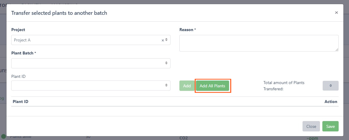 If you want to transfer all alive tagged plants from one batch to another you can do this with just one click. Clicking add all plants will add all alive plants in this batch to the selection of transferred plants.