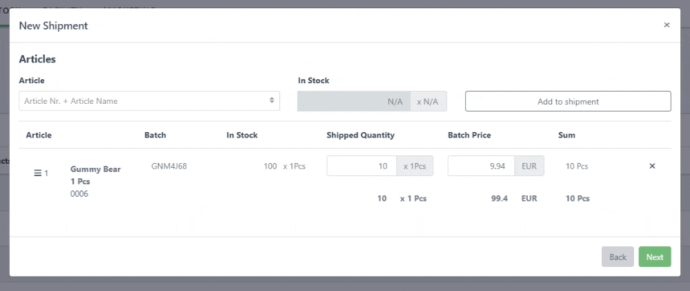 Article Batch stock adjustment