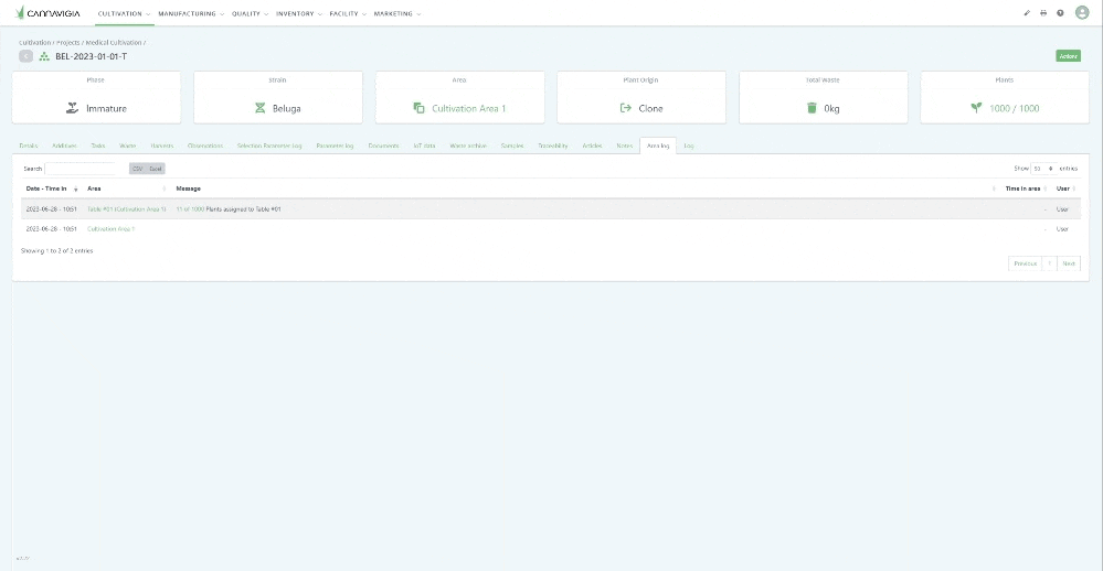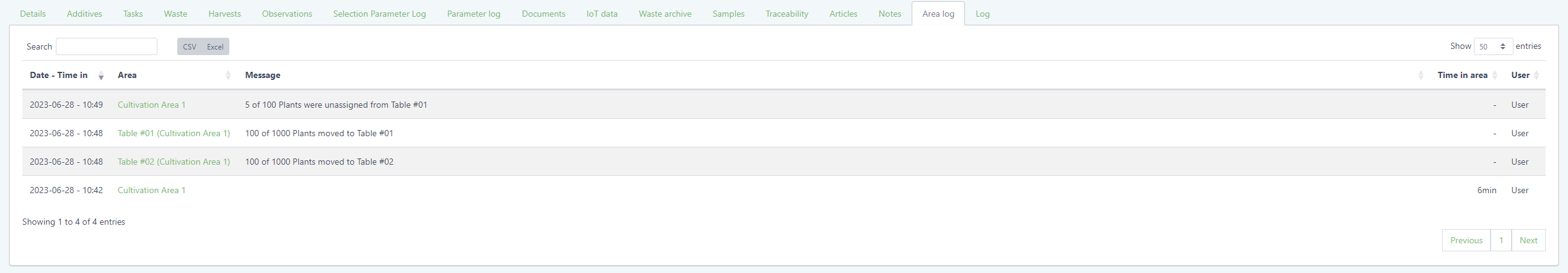 The area log now shows more clearly which plants (if tagged which plant IDs) have been moved to and from sub areas.