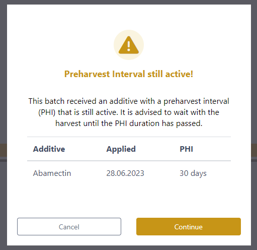 Warning if trying to harvest a plant batch that received an additive with a PHI
