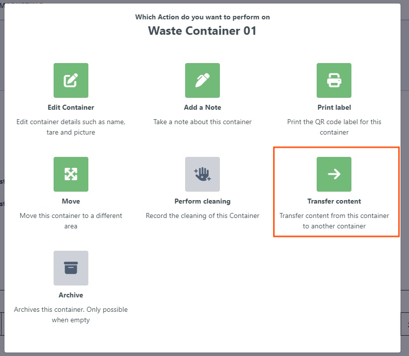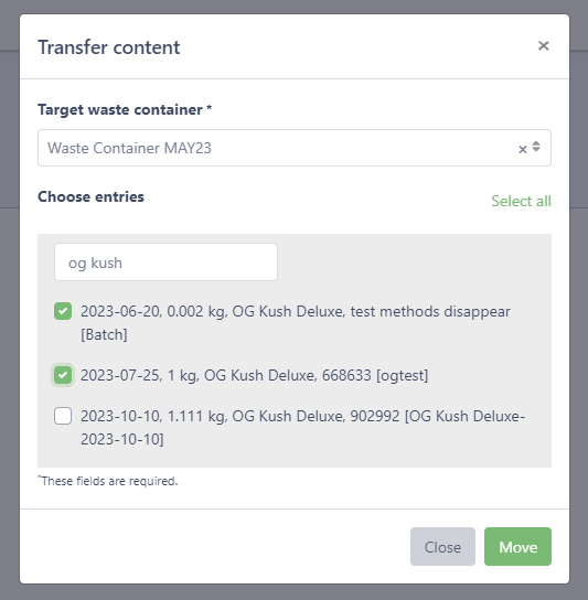 Now, managing waste is even more seamless. Our latest enhancement allows you to effortlessly transfer waste from one container to another within the Cannavigia system. Whether it's optimizing container space or ensuring compliance with specific disposal requirements, this feature empowers you to make informed decisions about your waste management.