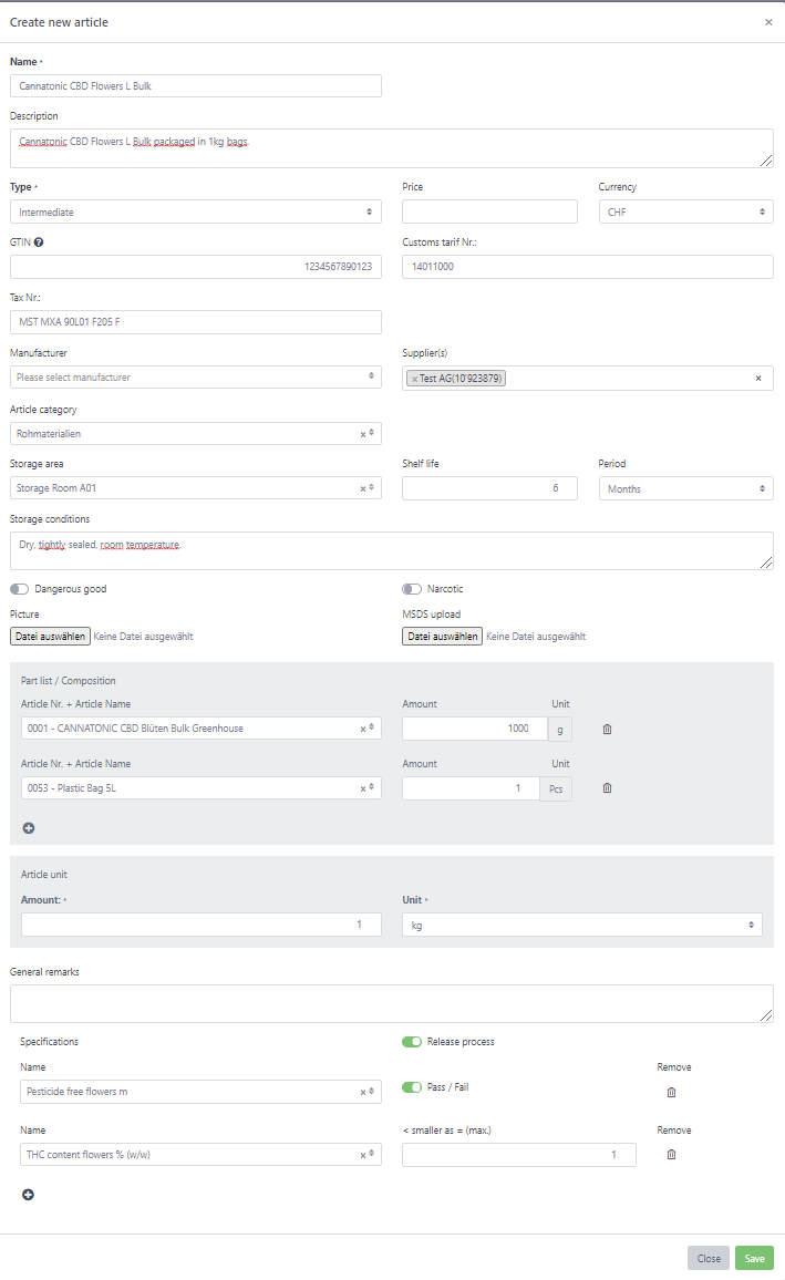 Define if you want to use our release system to make sure the article is fullfilling your quality specifications. Check the testing management on how to set up your testing methods.
